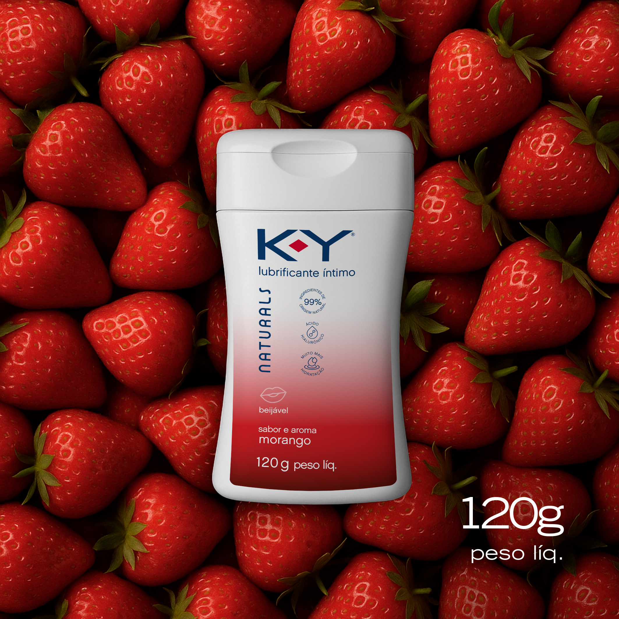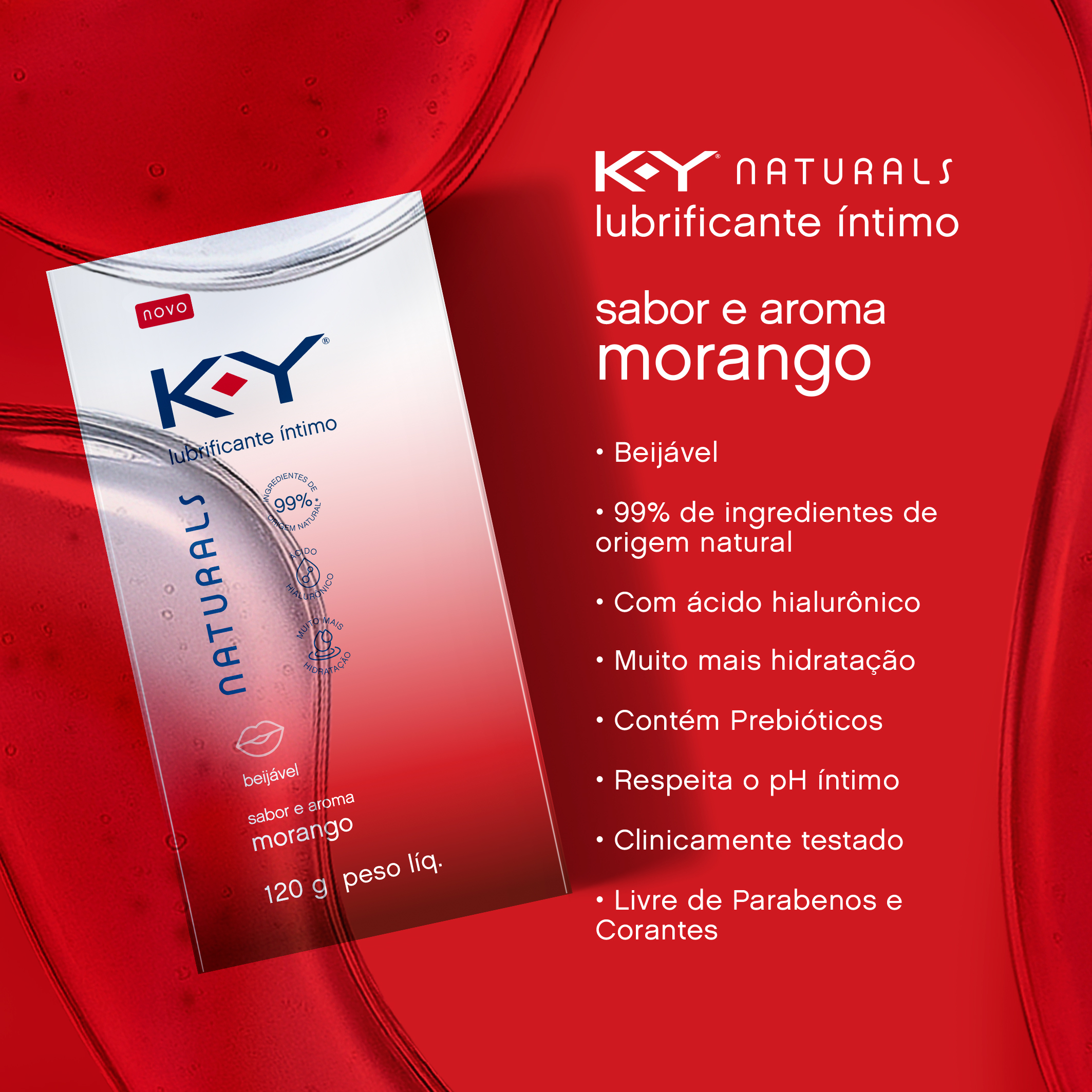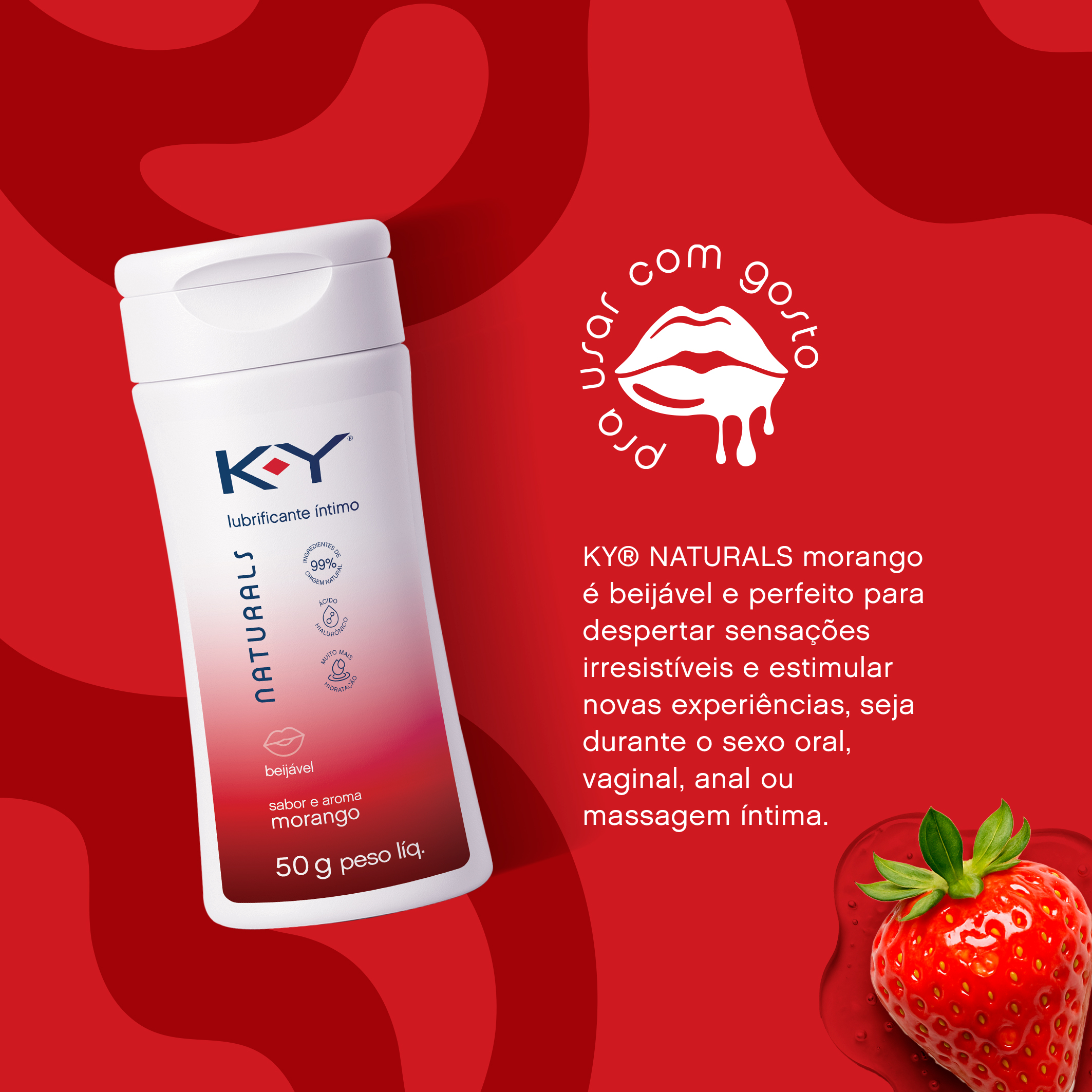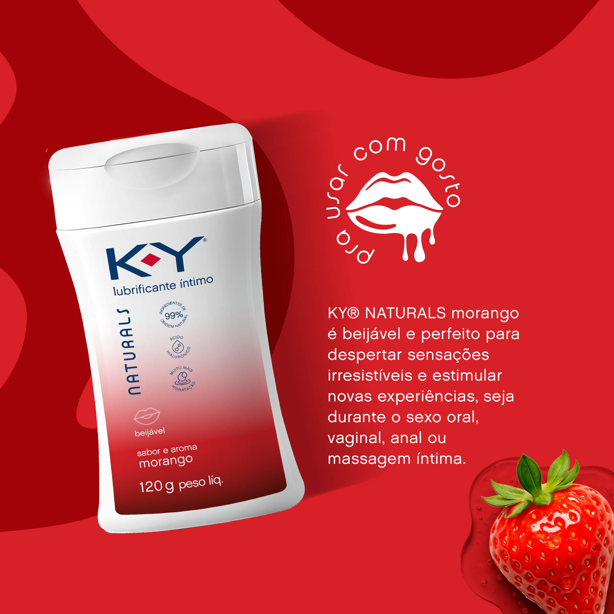 KY® NATURALS morango é o lubrificante íntimo beijável perfeito para despertar sensações irresistíveis e estimular novas experiências, seja durante o sexo oral, vaginal, anal ou massagem íntima, já que oferece alta espalhabilidade e duração da lubrificação com muito mais hidratação.