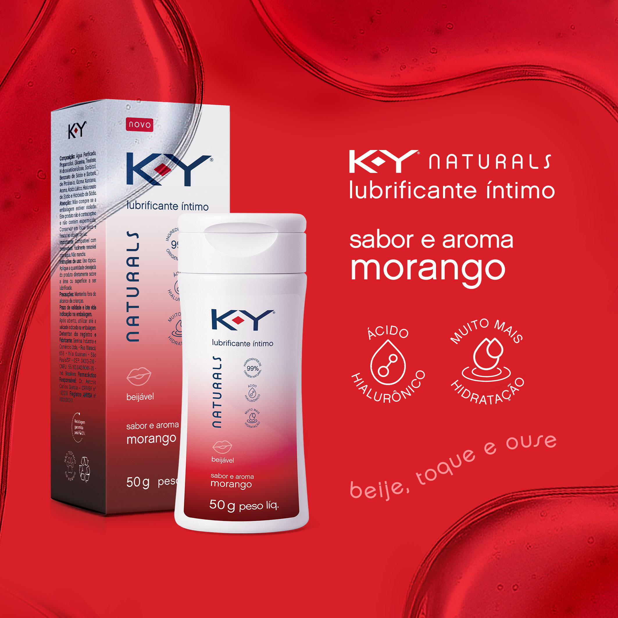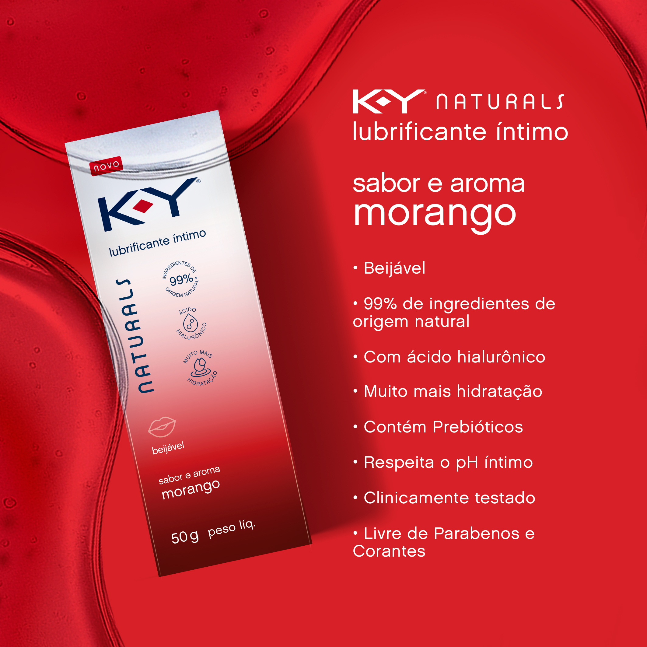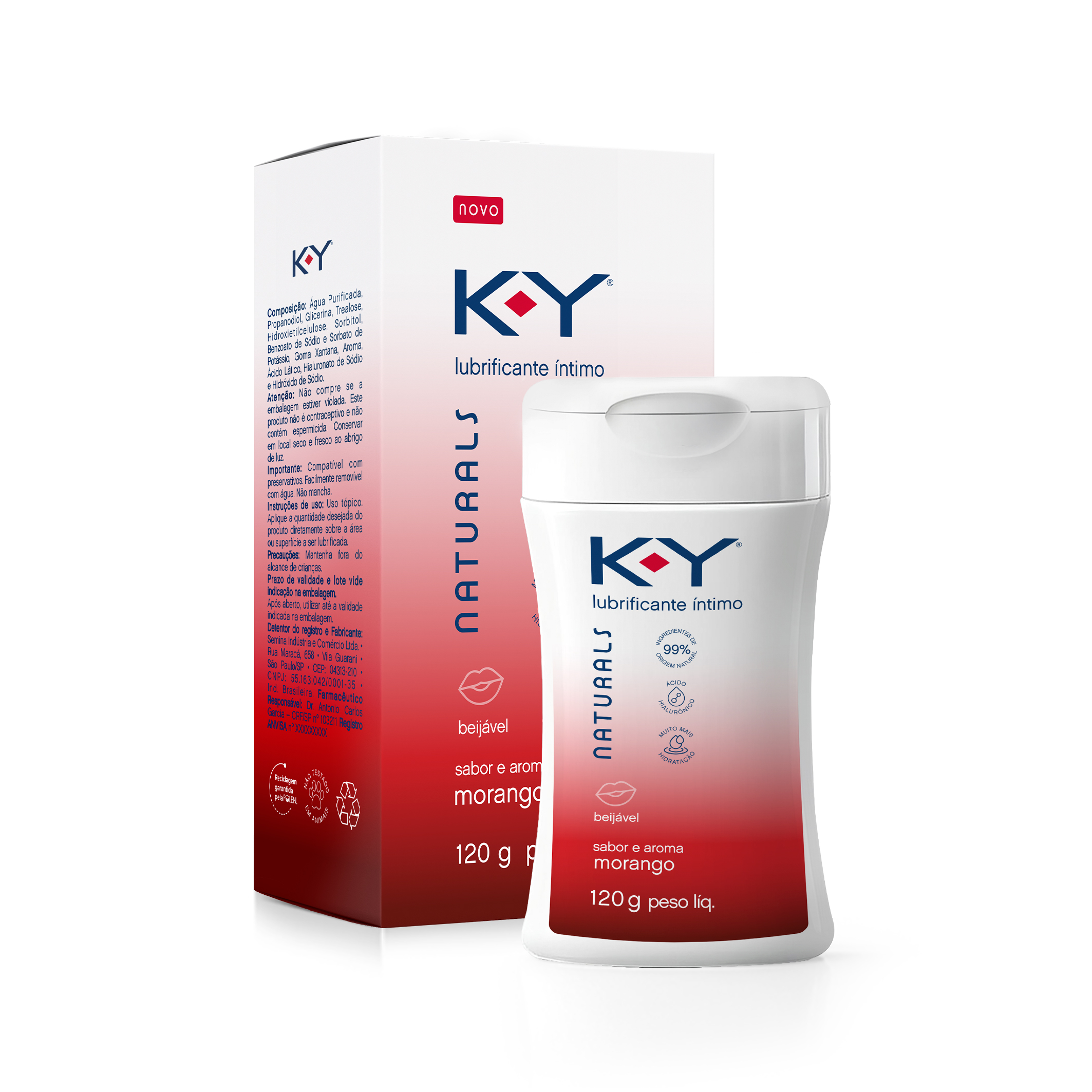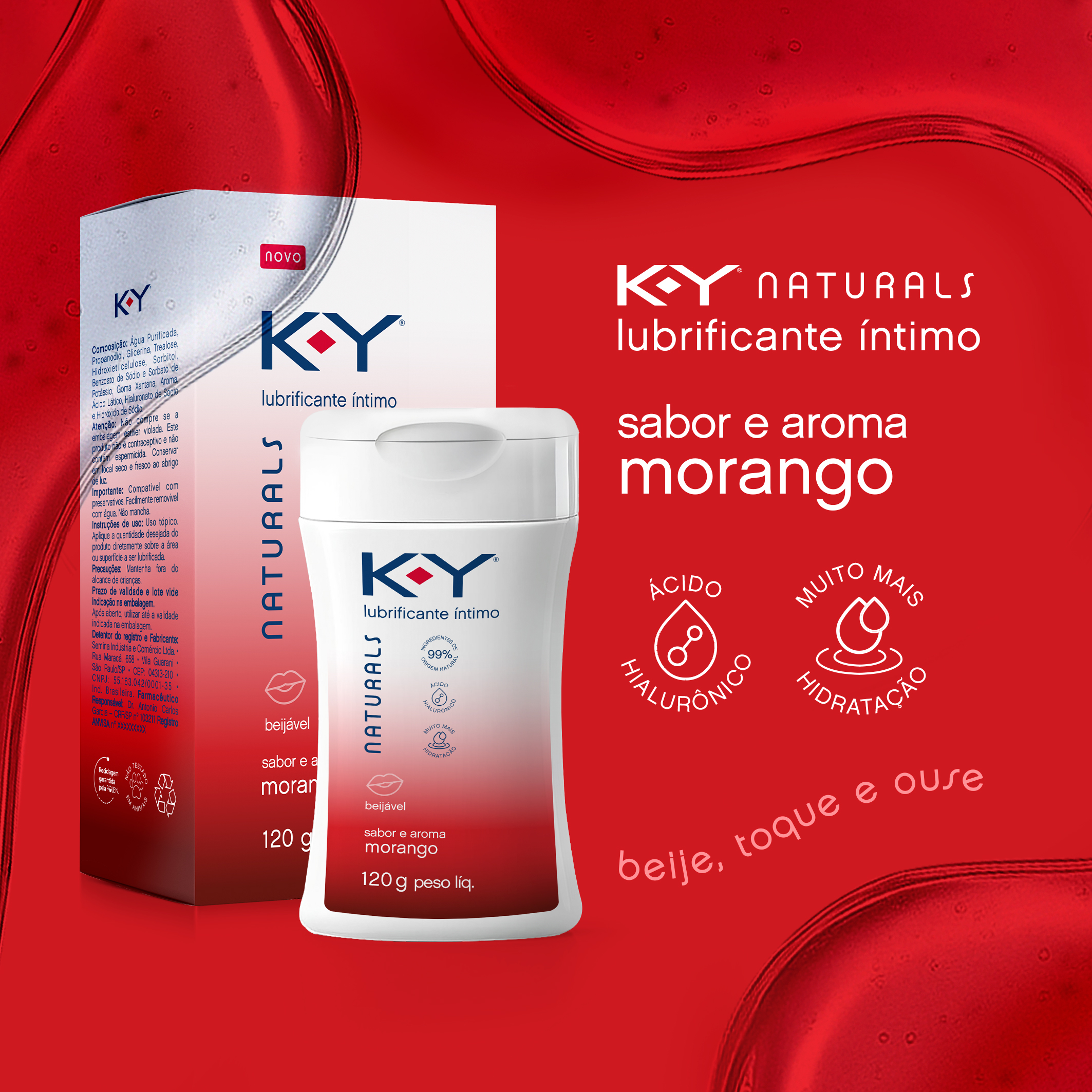 KY® NATURALS morango é o lubrificante íntimo beijável perfeito para despertar sensações irresistíveis e estimular novas experiências, seja durante o sexo oral, vaginal, anal ou massagem íntima, já que oferece alta espalhabilidade e duração da lubrificação com muito mais hidratação.