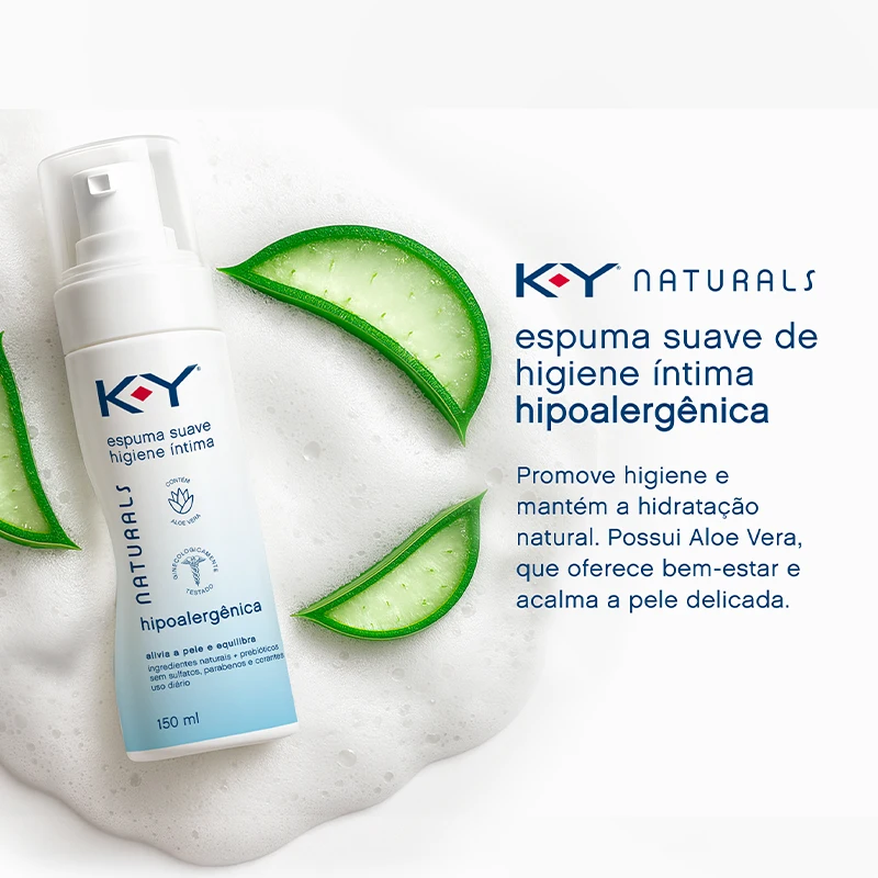 KY® NATURALS espuma suave de higiene íntima hipoalergênica tem fórmula suave, prebióticos, pH ácido (entre 3,8 e 4,5) e contém ingredientes naturais e veganos, como a Aloe Vera, que alivia e equilibra a pele sensível.
