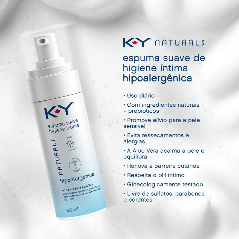 Assim como qualquer produto, KY® NATURALS espuma suave de higiene íntima hipoalergênica pode causar reações em pessoas com sensibilidade a algum componente da fórmula. Caso aconteça, é ideal suspender o uso e procurar orientação médica.